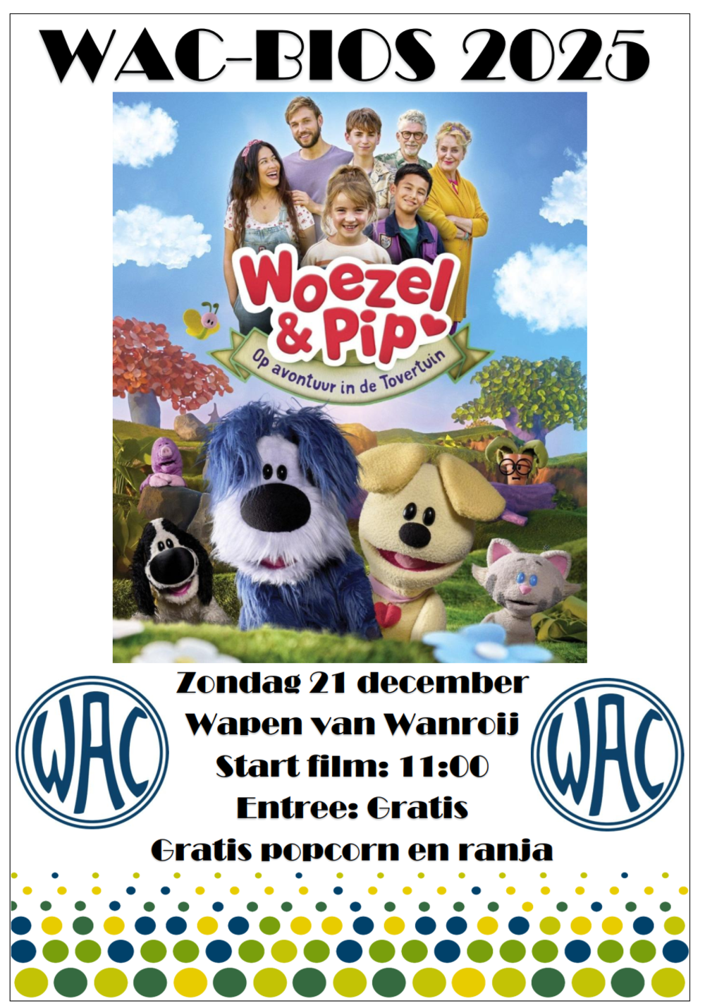 We openen onze WAC-Bioscoop dit jaar om 10:30 zodat we om 11:00 kunnen beginnen met een film voor de jongste inwoners van Wanroij en Landhorst. Dit jaar hebben we de film Woezel en Pip op avontuur in de Tovertuin. Samen met Sam en haar familie gaan de hondjes Woezel en Pip op vakantie. Alles lijkt perfect te gaan, tot ze onderweg hun knuffels en Pips hartenbandje kwijtraken. Lukt het ze om elkaar én het hartje terug te vinden?