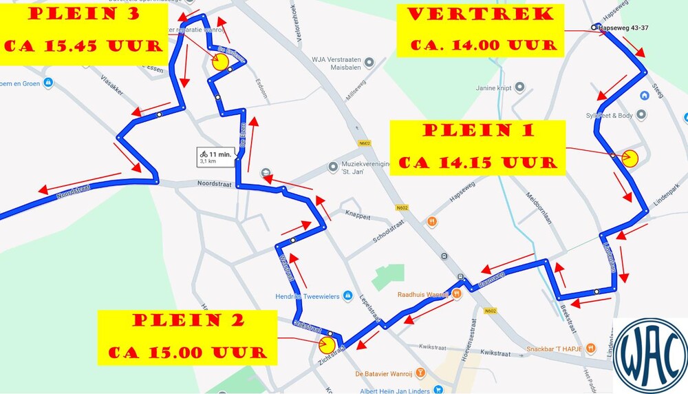 Dit jaar maken we weer een rondgang, vanaf 14.00 uur, mét 3 stops op diverse pleintjes, door Wanroij. De route vind je op het onderstaande kaartje.